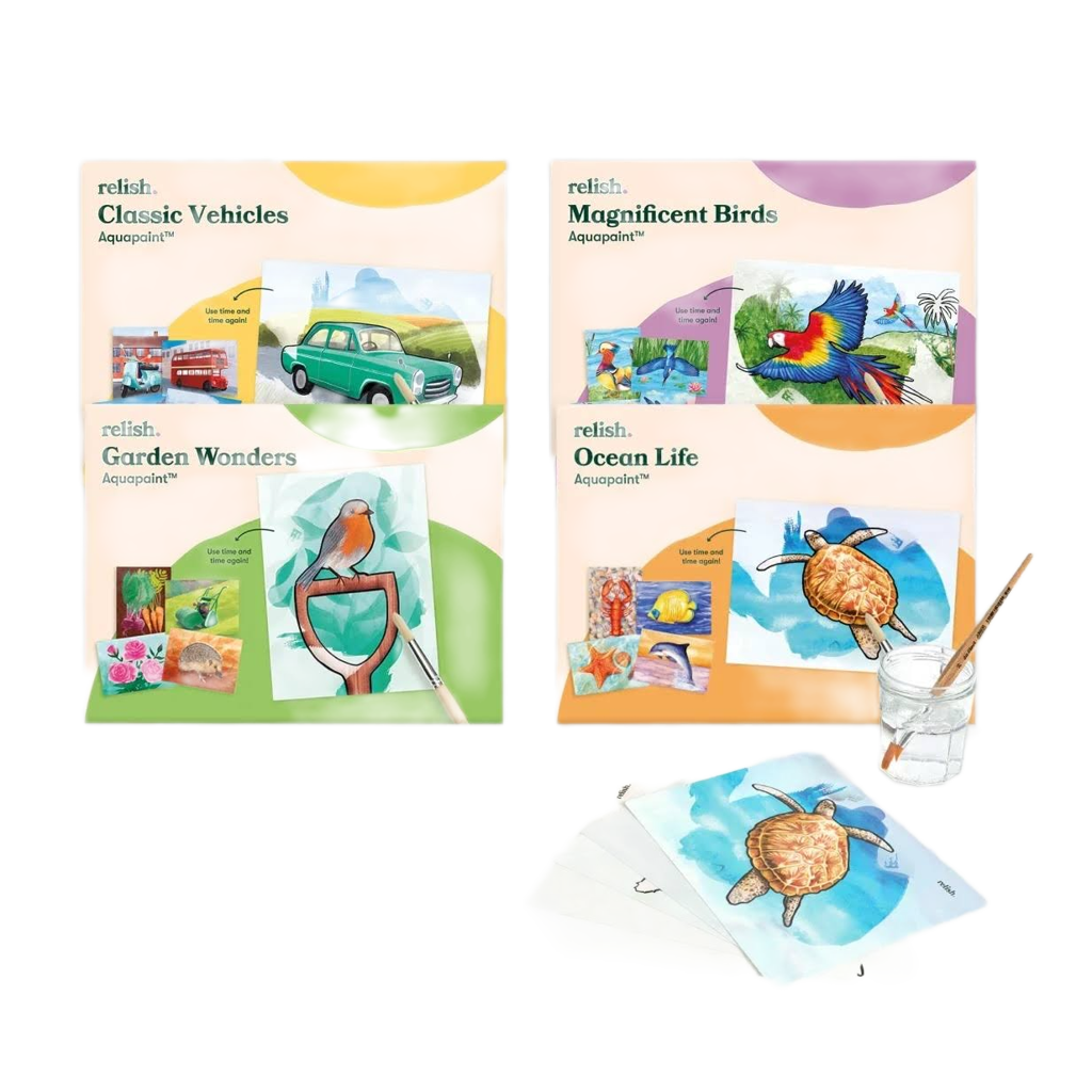 De Relish Aquapaint serie zijn sets met herbruikbare platen waarop alleen water nodig is om de afbeelding tevoorschijn te laten komen. Zodra de plaat uitdroogt, vervaagt de afbeelding weer en kan opnieuw gebruikt worden. Daardoor is er geen verf, geen schoonmaakstress, geen materiaalverspilling en minder afleiding of frustratie omdat dingen misgaan. Zo heb je in de serie;